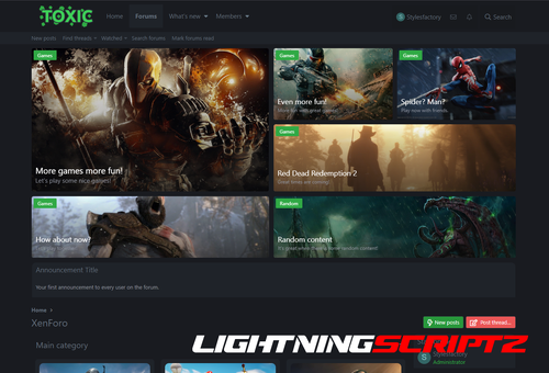 Titan is the ultimate gaming theme, based upon a large wallpaper image which is blurred behind textured navigation and category bars. Assign up to 6 background images via the theme settings to completely change the colour scheme, and let your members choose their favourite from a predefined selection!
