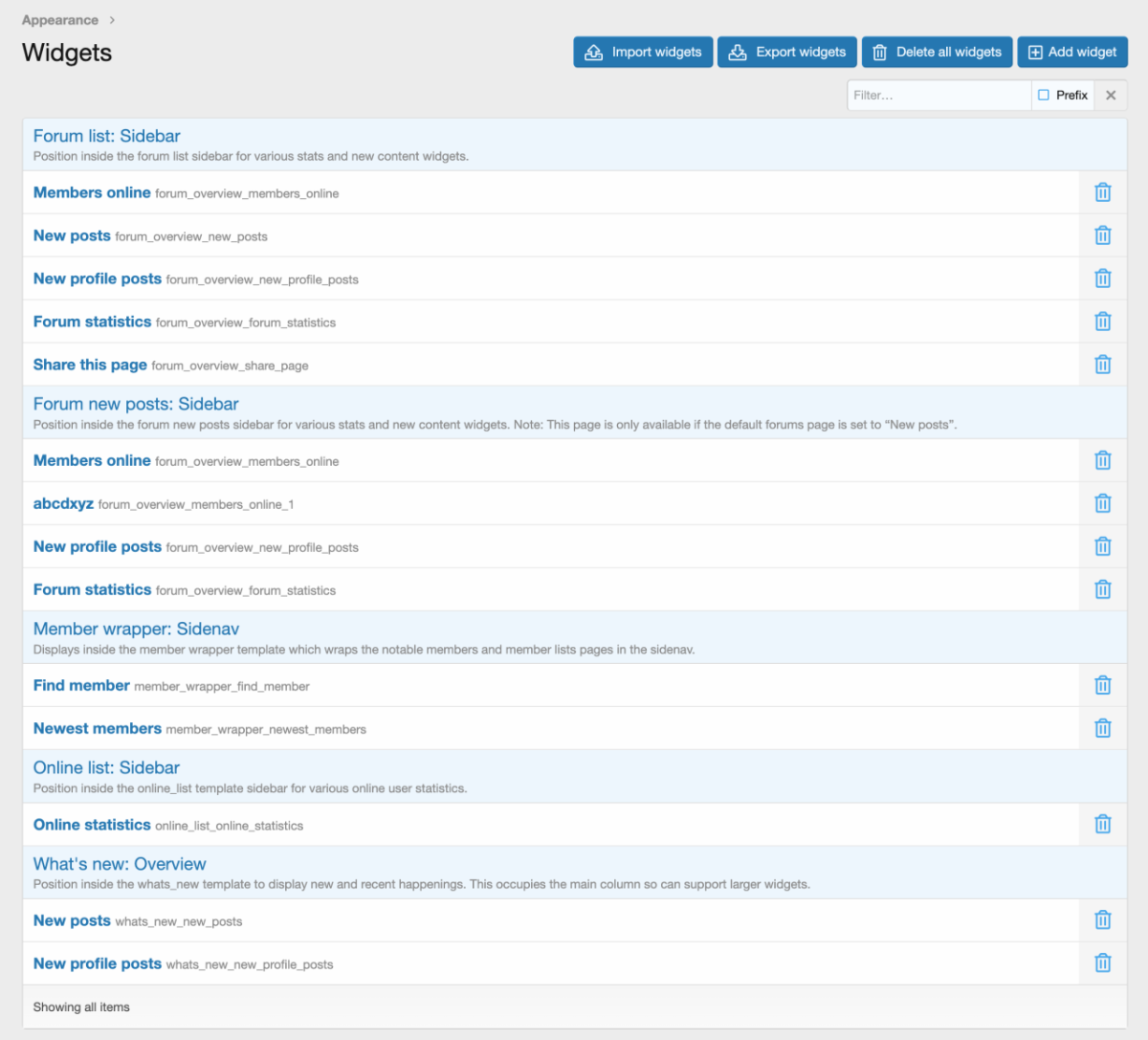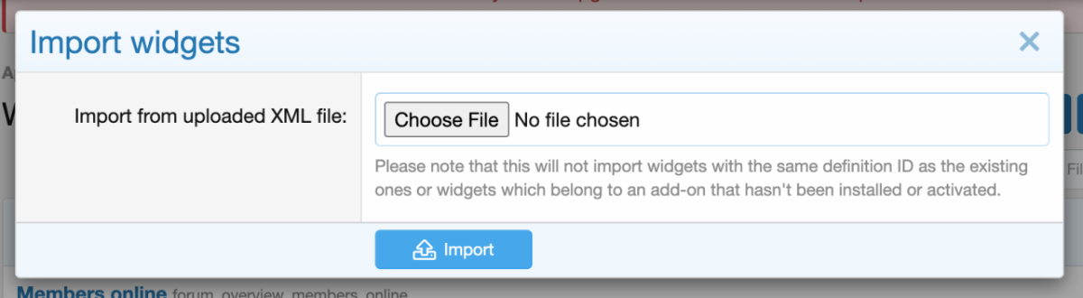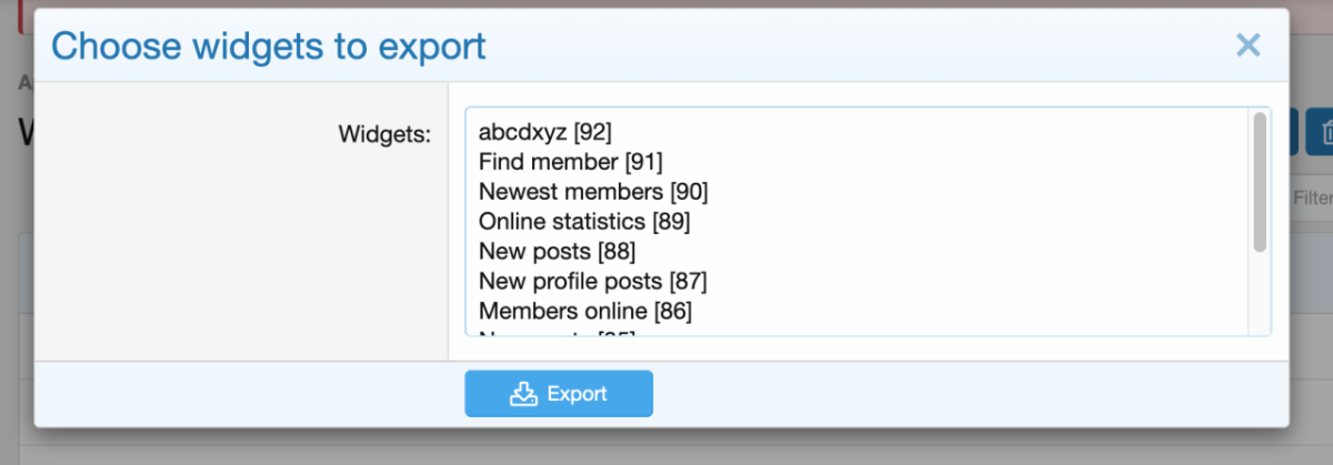 Add the possibility to export & import widgets. Can export specific widgets to XML file. Can import widgets from an uploaded XML file. Can delete all widgets with a one-click button.