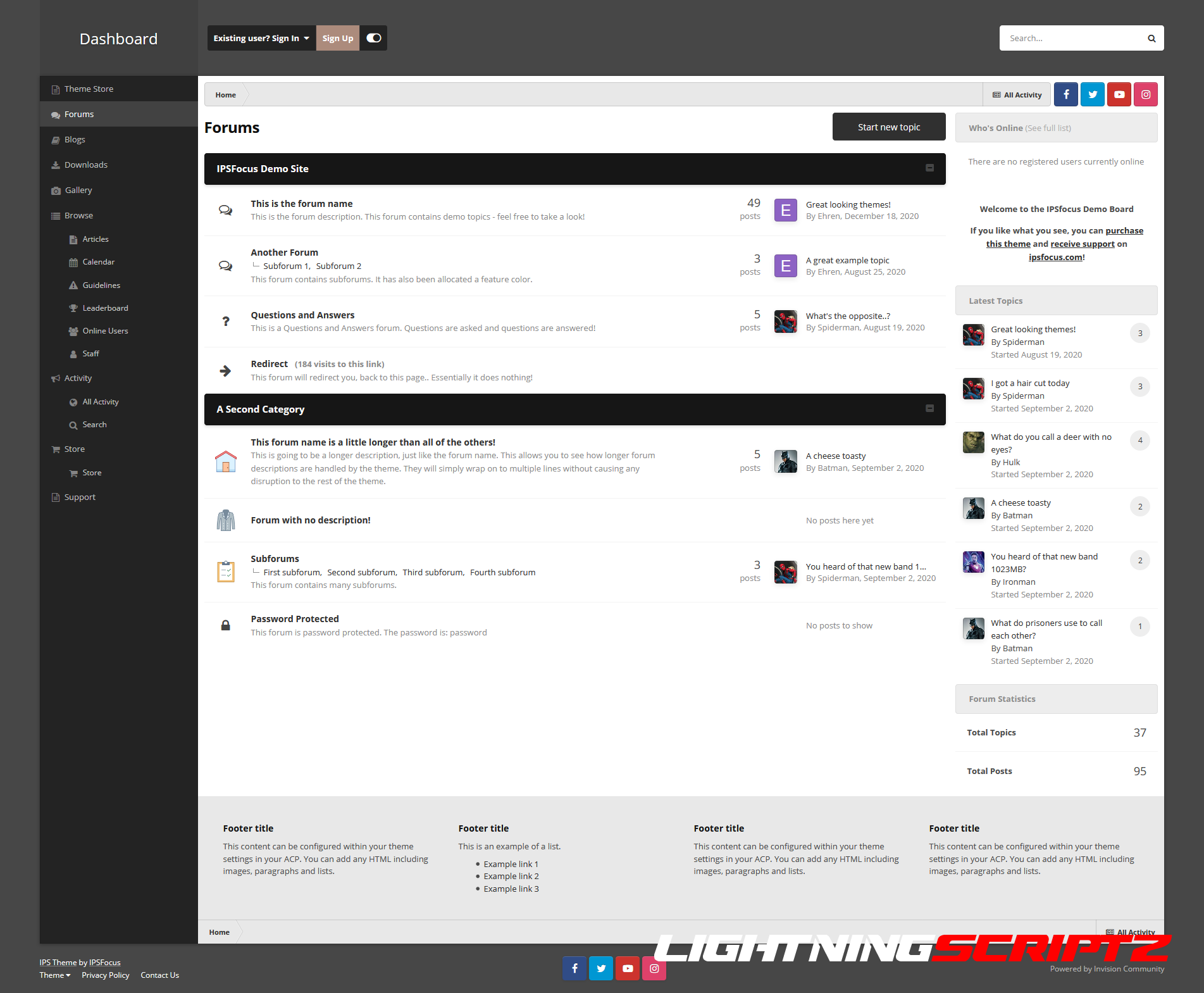 Dashboard is a feature-rich IPS theme that includes a beautiful blur effect behind the vertical navigation bar, a background changer, and "transparent" bars that allow the background image to change certain inner areas of the theme.