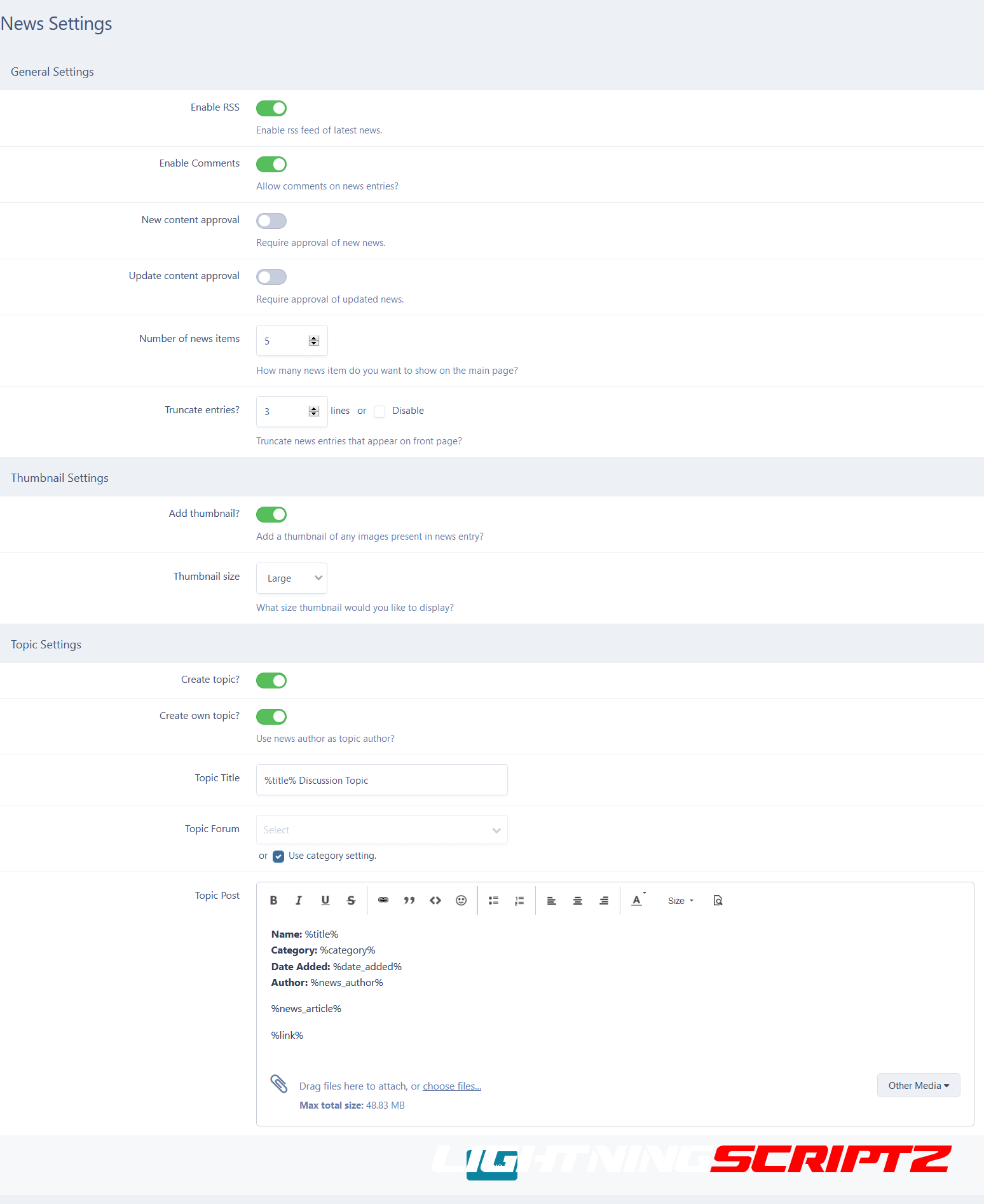Optional RSS feed export, including support for individual RSS feeds export for each news category.